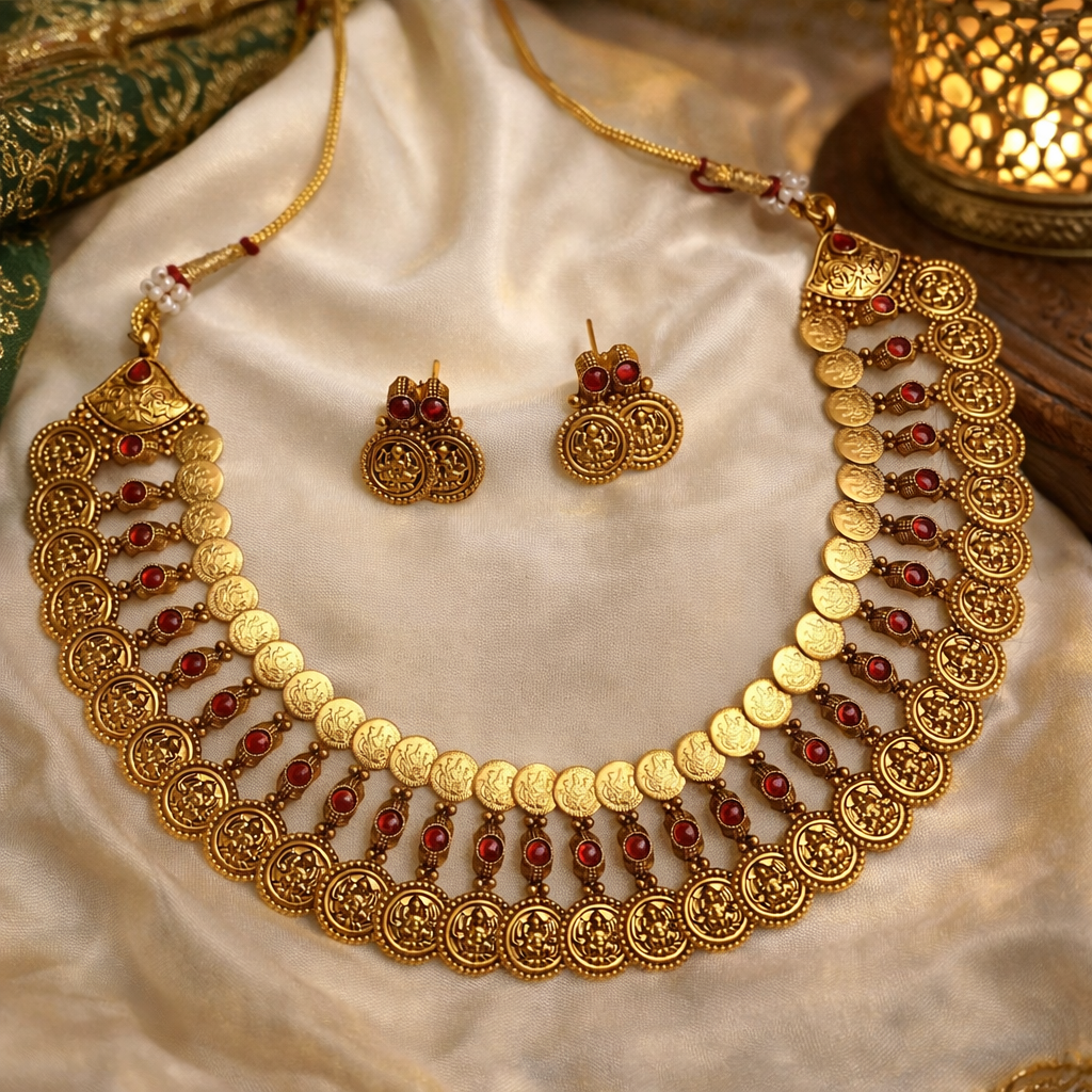 Shop the Antique Gold Lakshmi Coin Necklace Set with ruby accents. Traditional temple jewelry perfect for weddings, festivals, and ethnic wear. Order now!