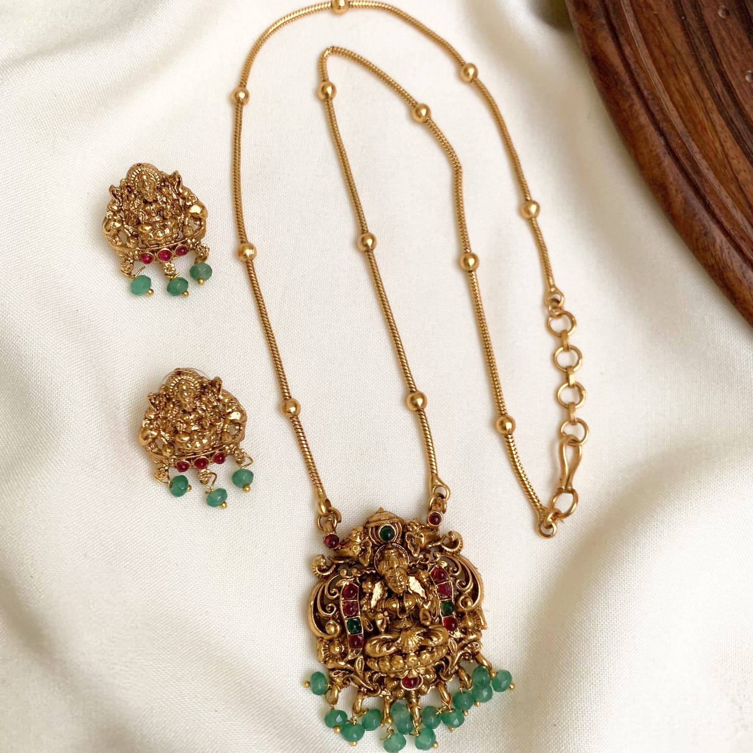 Classic Antique Gold Lakshmi Pendant Necklace Set with Green Bead Accents