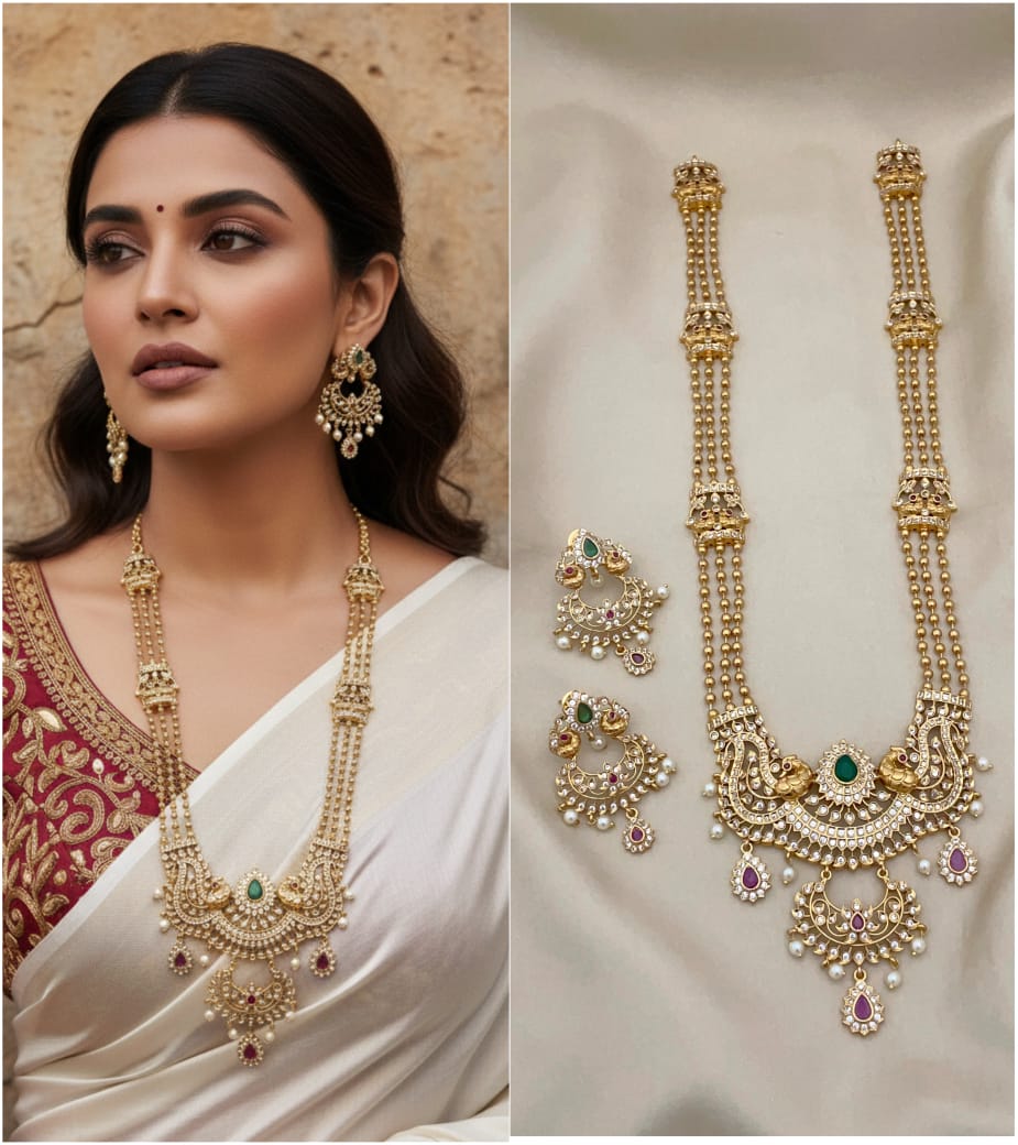 Elevate your traditional ensemble with this exquisite three-layer haram, a timeless piece that embodies sophistication and grace. Each layer is thoughtfully designed to create dimensional depth, allowing you to wear it as a complete statement or mix individual strands for versatile styling. Crafted with meticulous attention to detail, this haram seamlessly transitions from everyday elegance to festive occasions. The multi-layered construction adds volume and presence while maintaining refined proportions. Perfect for those who appreciate classic jewelry that commands attention through understated luxury and impeccable craftsmanship.